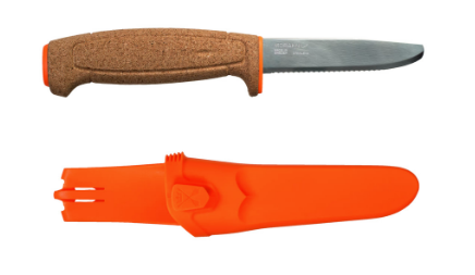 The ergonomic barrel-shaped handle of natural cork features a soft friction grip, sturdy finger guard and a 1.4 mm thick serrated blade made of recycled Swedish stainless steel, which provides both strength and stability in every cut. Thanks to the blade and handle design, the knife is ideal for working safely and efficiently in various weather conditions all year. The polymer sheath is equipped with the Morakniv Smart Button System which means you can attach several craft knives for different purposes to each other. It also has a practical belt clip for easy attachment to the belt.