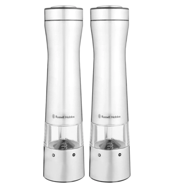 Russell Hobbs Salt & Pepper Mills. Product Type: Salt & Pepper Grinder Set, Product Colour: Grey Stainless Steel. Width: 65 Mm, Depth: 125 Mm, Height: 240 Mm