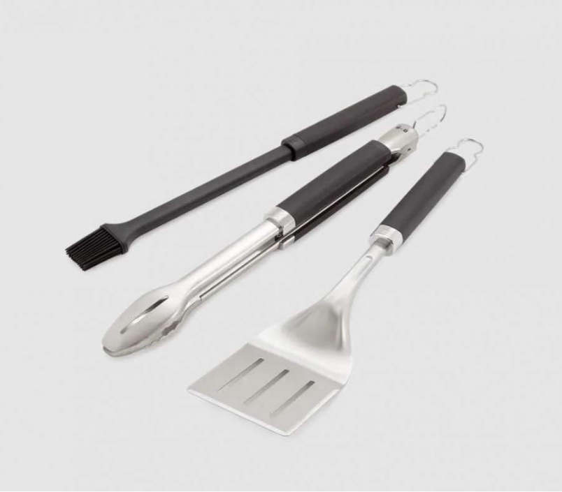 Made of durable steel Tongs have locking handle for storage Spatula has angled neck reaches over edge of grill Soft-touch handles are comfortable Slightly scaled-down size